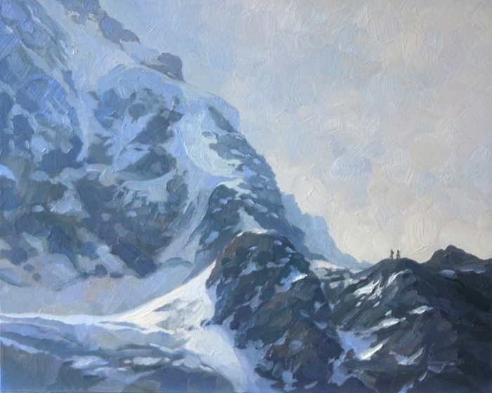 The day was mostly clear, but some clouds threatened a storm on the ridge of the Jungfrau. Jagged rocks, sunlight on deep snow, and the ominous blue clouds rolling down the side of the mountain created a beautiful visual drama---I knew I would paint it as soon as I got back to my easel.